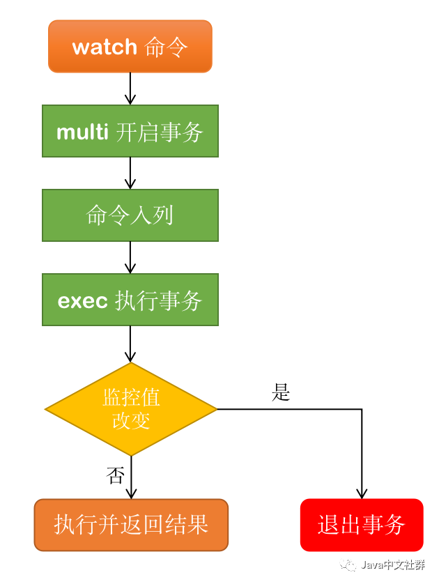从以上命令可以看出,如果 exec 返回的结果是 nil 时,表示 watch 监控的对象在事务执行的过程中被修改了。从 getk 的结果也可以看出,在事务中设置的值 setk v2 并未正常执行。执行流程如下图所示: