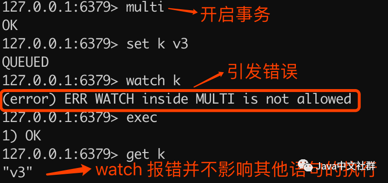 注意:watch 命令只能在客户端开启事务之前执行,在事务中执行 watch 命令会引发错误,但不会造成整个事务失败,如下代码所示: