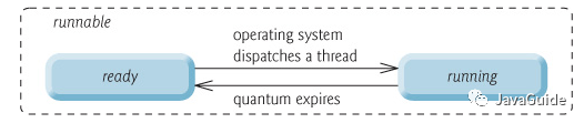 操作系统隐藏 Java虚拟机(JVM)中的 RUNNABLE 和 RUNNING 状态,它只能看到 RUNNABLE 状态(图源:HowToDoInJava:Java Thread Life Cycle and Thread States),所以 Java 系统一般将这两个状态统称为 RUNNABLE(运行中) 状态 。