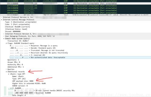 乍一看是的ICMP报文实际上它包含了整个攻击者发出的完整DNS请求报文
