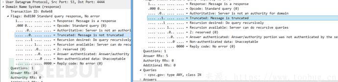 我在复现DNS反射攻击的时候发现了一个问题,就是我获得的回应报文远远小于攻击者获得的回应报文,我获得的大概只有500多自己而攻击者获得的确有3000多字节,我们查询同样的域名cpsc.gov 同样的type为ANY,为啥结果不同呢,然后我对比了两个报文的差别