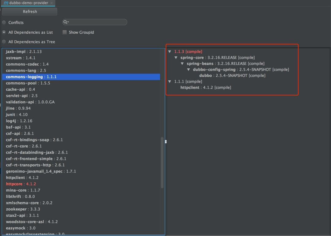 红色的就是出现依赖冲突,例如图中的commons-logging,点击进入我画框框的地方,他就会从依赖路径上给你分析依赖冲突的路径.其实这个的原因也很简单,就是利用Maven的依赖树命令
