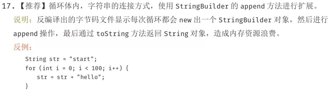所以,阿里巴巴Java开发手册建议:循环体内,字符串的连接方式,使用 StringBuilder 的 append 方法进行扩展。而不要使用+。