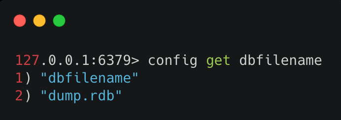 Redis 中可以使用命令查询当前配置参数。查询命令的格式为:configgetxxx ,例如,想要获取 RDB 文件的存储名称设置,可以使用 configgetdbfilename ,执行效果如下图所示: