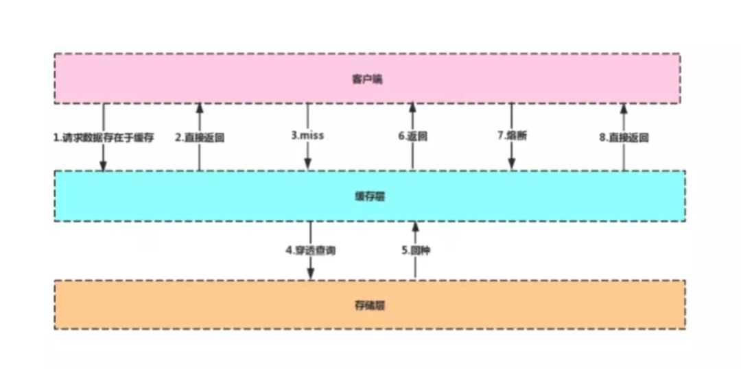 客户端在对数据库发起请求时,先到缓存层查看是否有所需的数据,如果缓存层存有客户端所需的数据,则直接从缓存层返回,否则进行穿透查询,对数据库进行查询。