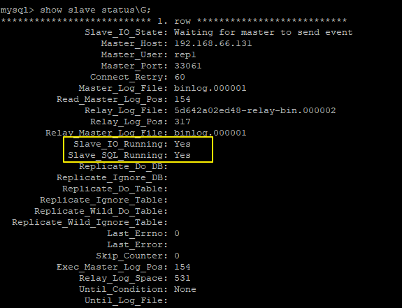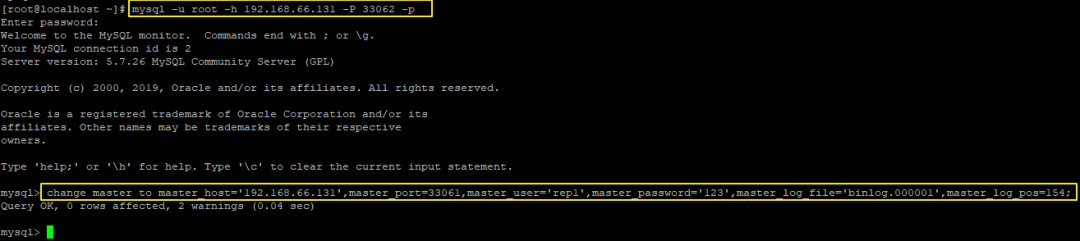 change master to master_host='192.168.66.131',master_port=33061,master_user='rep1',master_password='123',master_log_file='binlog.000001',master_log_pos=154;