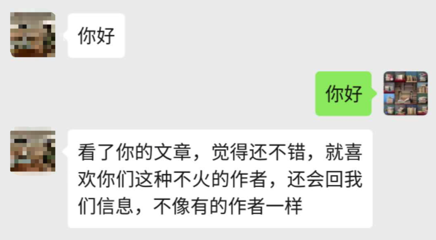然而此时,手机突然响了,原来是有人加了我的微信,于是随手点了一下同意,对方发了一句“你好”,我也礼貌的回了一句“你好”,然后就有了那条令我哭笑不得的消息:“看了你的文章,觉得还不错,就喜欢你这种不火的作者,还会回我的信息,不像有的作者一样”,顷刻之间所有的注意力都被这行文字吸引,只是傻笑的捧着手机,说了那句特别能表达内心情感的话“我C”。。。