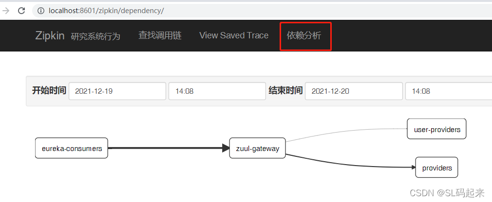 之后进入zipkin界面点击依赖分析就可以看到调用链。这样SpringCloud Sleuth基本操作就完成了。
