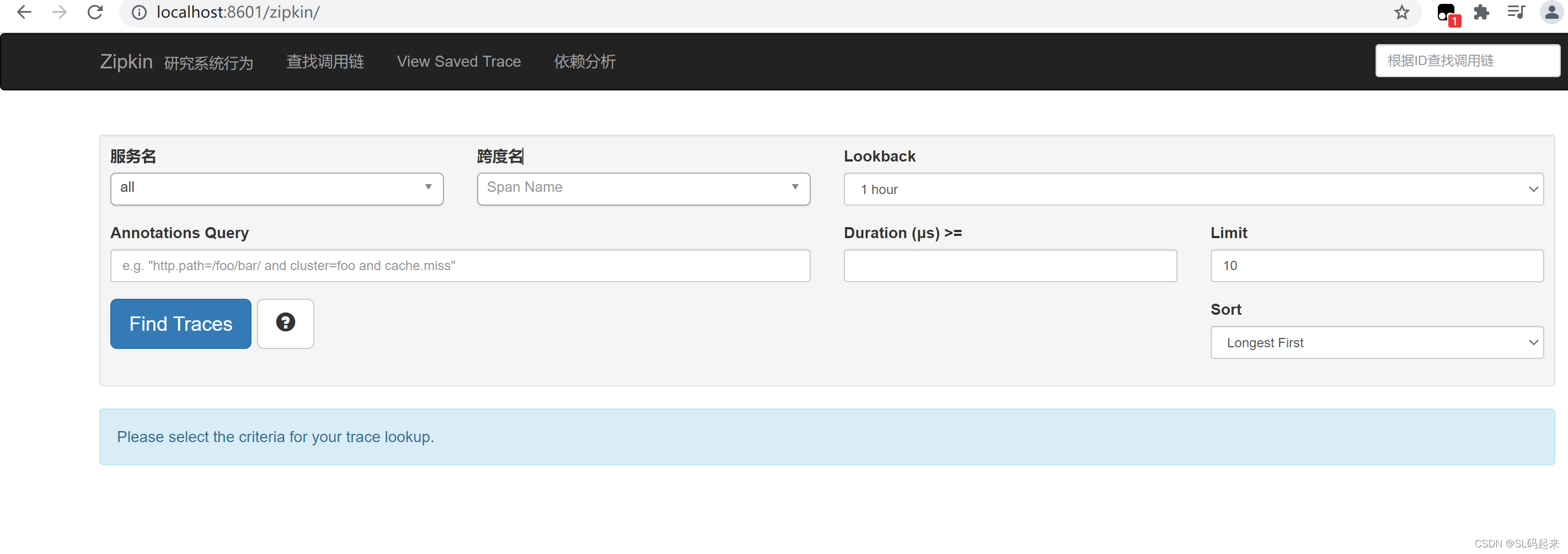 4、访问http://localhost:8601/,出现下面界面zipkin链路监控界面搭建就完成了
