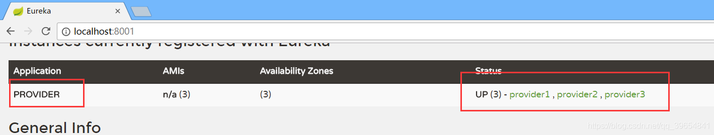 eureka server启动后,看到如下界面证明三个生产者创建成功,会显示有三个生产者,左边红框内是生产者集群名称,消费者在通过IP和port调用生产者接口时都是通过集群名称调用的,右边红框是实例名称
