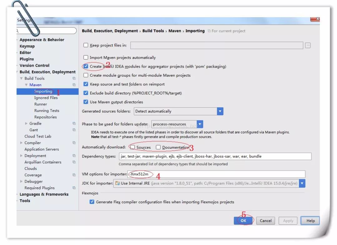 2)如上图标注3 所示,在 Maven 导入依赖包的时候是否自动下载源码和文档。默认是没有勾选的,也不建议勾选,原因是这样可以加快项目从外网导入依赖包的速度,如果我们需要源码和文档的时候我们到时候再针对某个依赖包进行联网下载即可。IntelliJ IDEA 支持直接从公网下载源码和文档的。