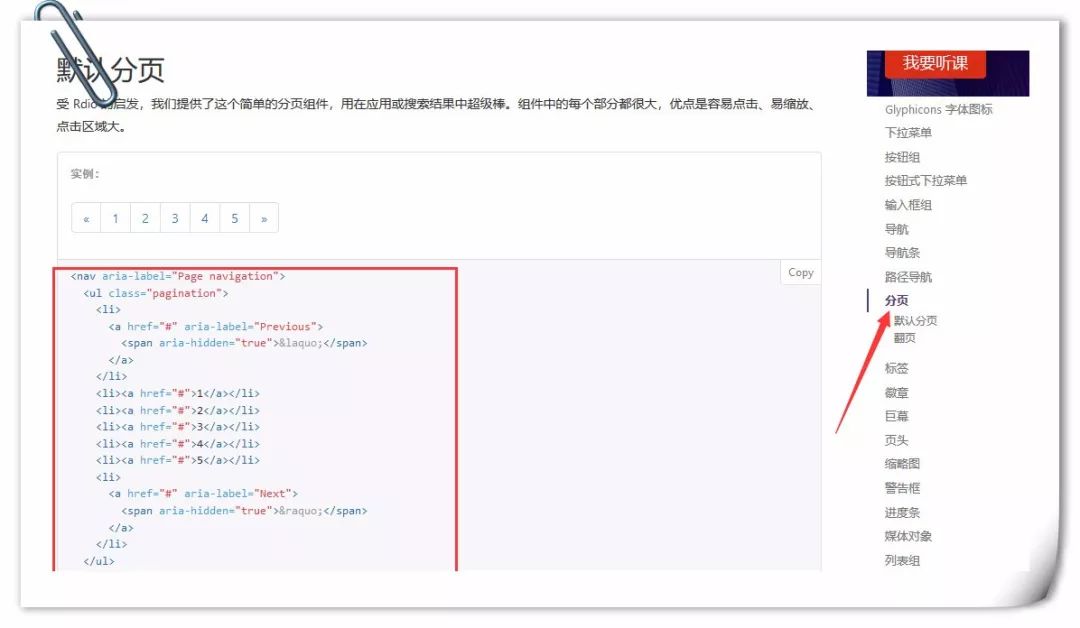 3.分页显示位置填上分页插件的代码,这个分页插件也在bootstrap官方文档中找如图: