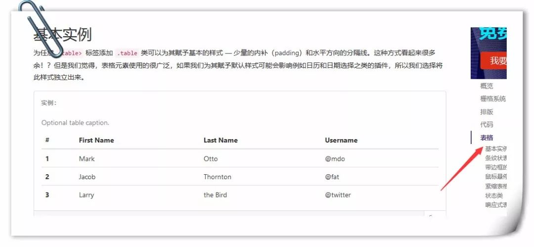2.在内容的div中添加一个表格,这个按钮也在bootstrap官方文档中找如图: