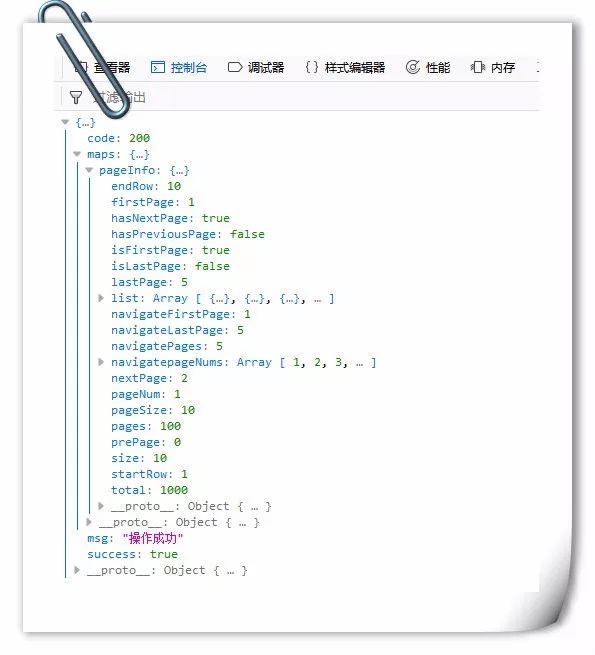 从上图可以看出数据获取到前端了,并且非常详细,分页信息,数据源,多少页,多少记录数等等都显示出来了。现在就直接可以拼接前端的标签代码了。