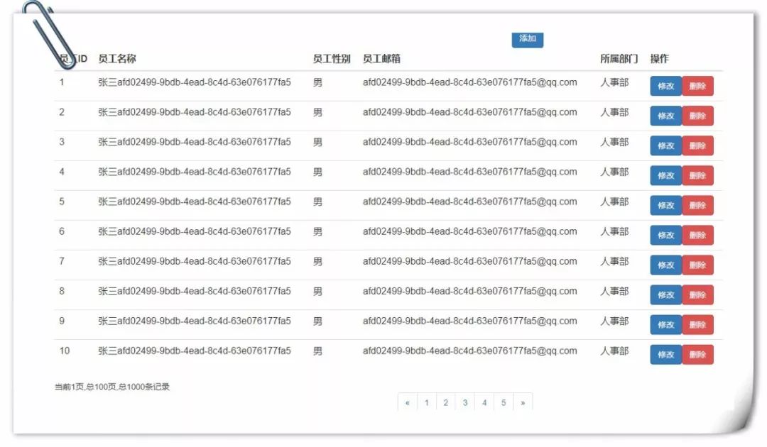 @RequestMapping("/list") @ResponseBody public Message list(@RequestParam(value = "pageIndex",defaultValue = "1") Integer pageIndex) throws Exception { PageHelper.startPage(pageIndex, pageSize); Listemployees = employeeService.findALL(null); //用PageInfo对结果进行包装,每次连续显示为5页 PageInfopageInfo = new PageInfo<>(employees,5); return Message.getSuccess().addAttribute("pageInfo",pageInfo); }web.xml的配置就不用多说了,如果需要的可以直接github地址上查看代码,现在运行结果。