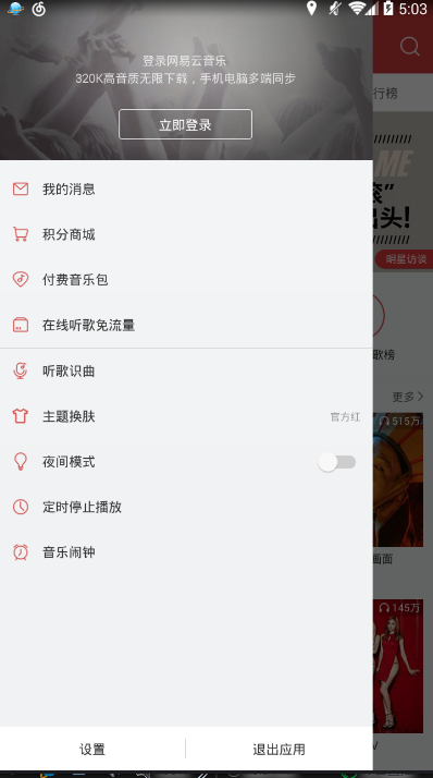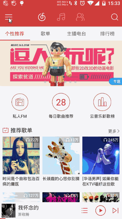 NavigationDrawer 是 Google 在 Material Design 中推出的一种侧滑导航栏设计风格。说起来很抽象,我们来看下网易云音乐侧滑导航栏的实现效果