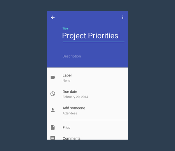 设计范例中,控件的实现需要让用户在输入的过程中不会丢失上下文信息,它是在去年跟Material Design一起被谷歌介绍的。在这之前,没有让开发者将这个控件应用到实际项目中的支持库。现在,如果你的应用有类似数据输入的地方,你终于可以完全遵循material design 了。