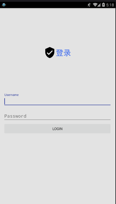 这个用户界面非常简单。它显示了一个“登录”文字与两个EditText元素,一个是为用户名准备的,一个是为密码准备的。布局中还包含了一个触发登陆流程的按钮。背景颜色是扁平风格的灰色。