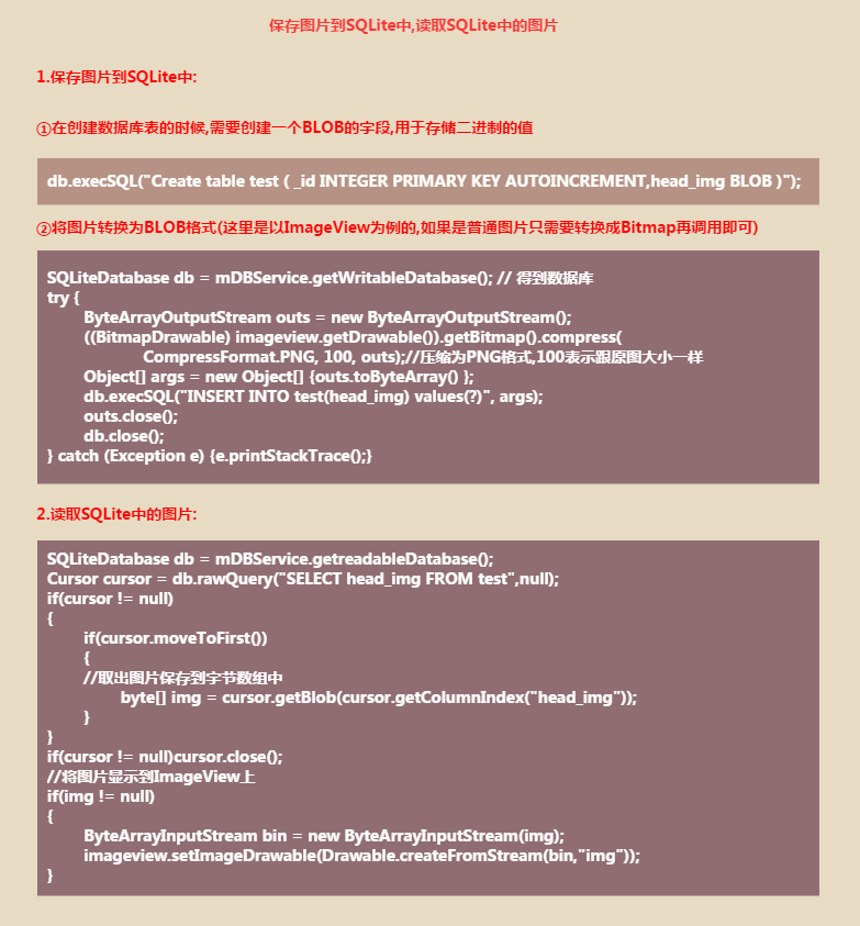 当然,一般我们很少往数据库中存储大二进制文件,比如图片,音频,视频等,对于这些我们一般 是存储文件路径,但总会有些奇葩的需求,某天你突然想把这些文件存到数据库里,下面我们以 图片为例子,将图片保存到SQLite中,以及读取SQLite中的图片!