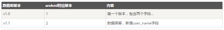 答:假如我们开发了一款APP,里面用到了数据库,我们假定这个数据库版本为v1.0, 在这个版本,我们创建了一个x.db的数据库文件,我们通过onCreate()方法创建了第一个table, t_user,里面有两个字段:_id,user_id;后面我们想增加一个字段user_name,这个时候 我们就需要对数据库表的结构进行修改了,而我们可以把更新数据库的操作梵高onUpgrade() 方法中,我们只需要在实例化自定义SQLiteOpenHelper的时候,修改版本号,比如把1改成2 这样,就会自动调用onUpgrade()的方法了!另外,对于每个数据库版本我们都应该做好 相应的记录(文档),类似于下面这种: