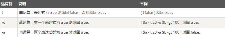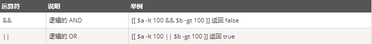 10 -lt 100 -o 20 -gt 100 : 返回 false 逻辑运算符