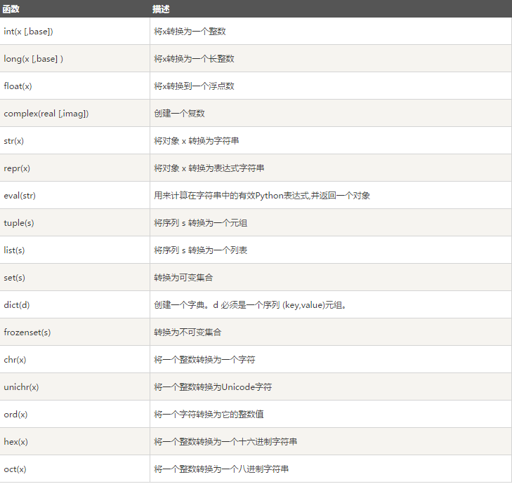 以下几个内置的函数可以执行数据类型之间的转换。这些函数返回一个新的对象,表示转换的值。