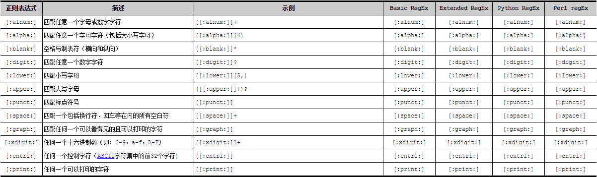 POSIX字符类是一个形如[:…:]的特殊元序列(meta sequence),他可以用于匹配特定的字符范围。