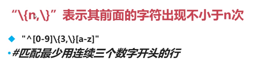 "\{n,\}"表示其前面的字符出现n次以上 "^[0-9]\{3\}[a-z]"以数字开头,且三个以上字母的行 元字符 \{n,m\}