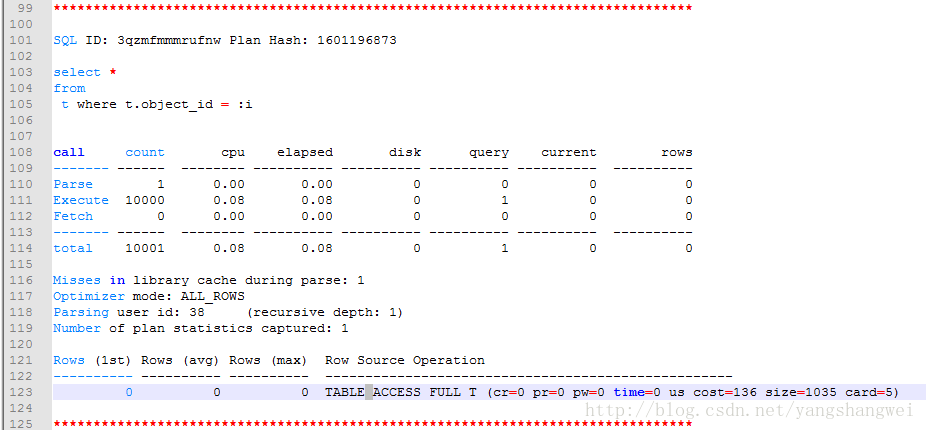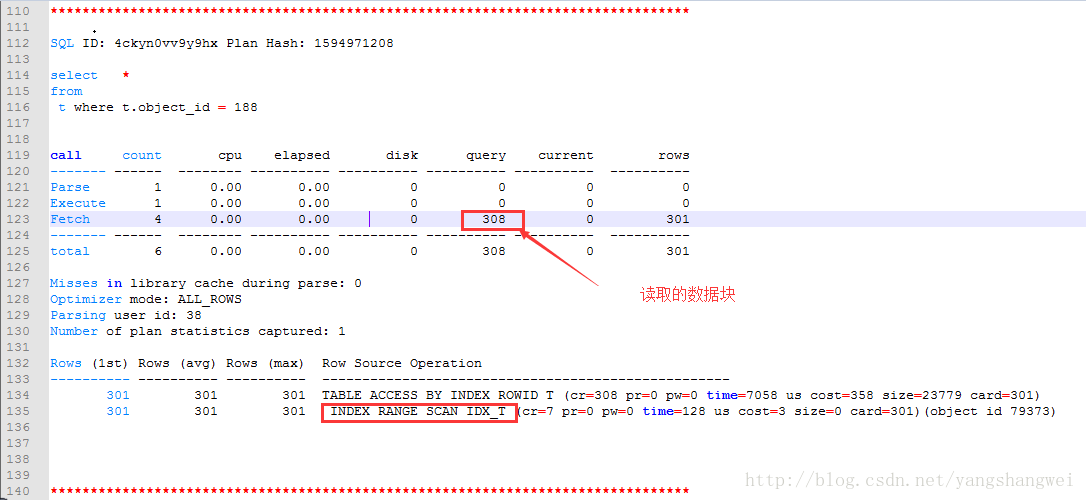 从trace文件中可以看到,在fetch阶段,全表扫描读取了42093多个数据块,而走索引的,在fetch阶段,仅仅读取了308个数据块。