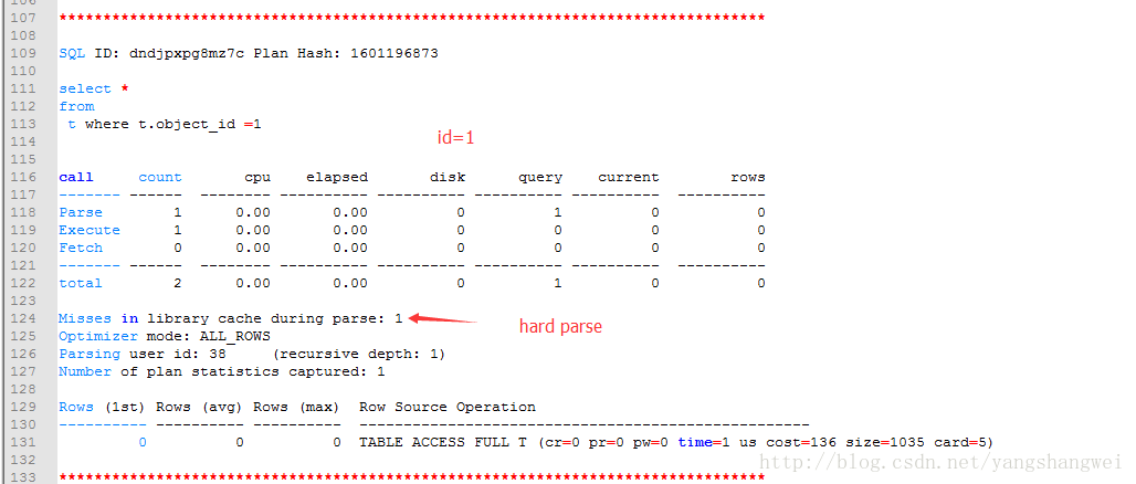 以上的这些工作,我们通常称为硬分析(hard parse),其实是十分消耗系统资源的。 而对于相同Hash值的SQL已经存在于共享池中则称为软分析(soft parse)。