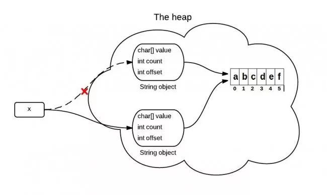 当调用substring方法的时候,会创建一个新的string对象,但是这个string的值仍然指向堆中的同一个字符数组。这两个对象中只有count和offset 的值是不同的。