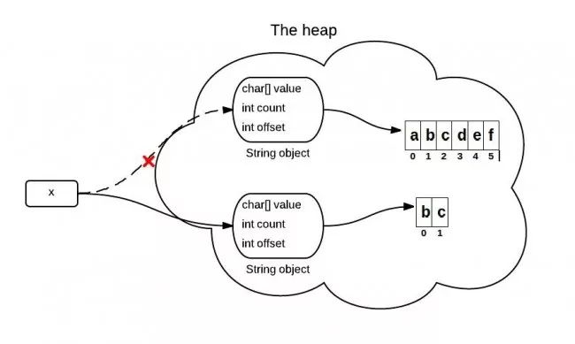 你可能知道,因为x是不可变的,当使用x.substring(1,3)对x赋值的时候,它会指向一个全新的字符串: