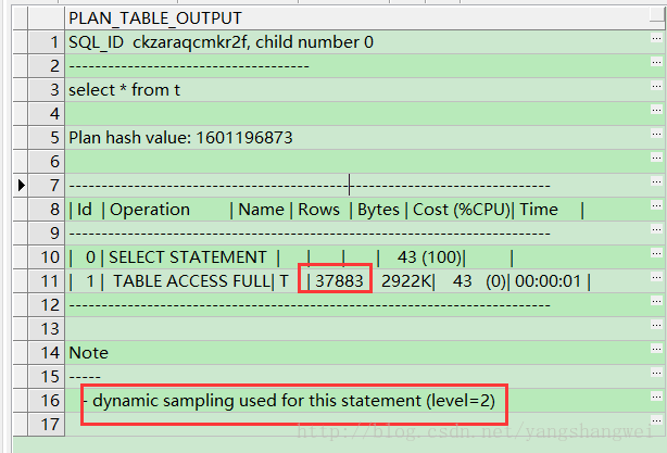 通过这一点,我们可以看出,此时 CBO 能够使用的信息非常有限,也就是这个表有几个 extent,有几个 block。 但动态采样之后, Oracle 立即发现,原来数据块中都是空的。