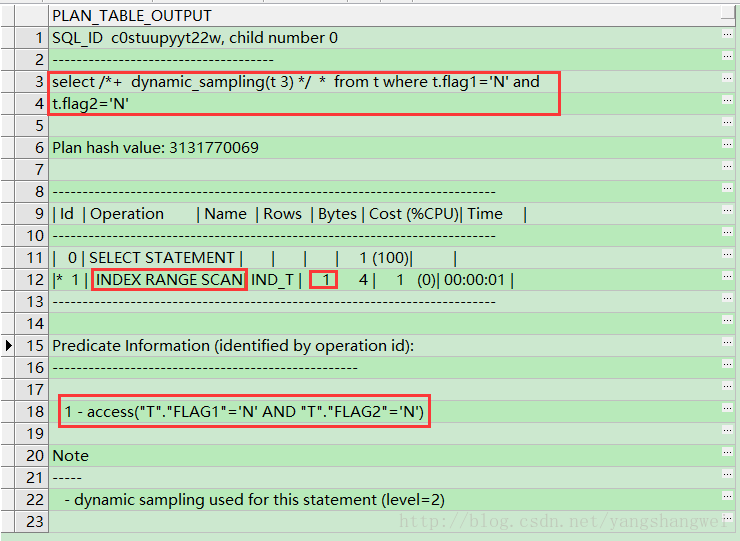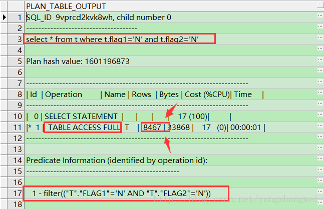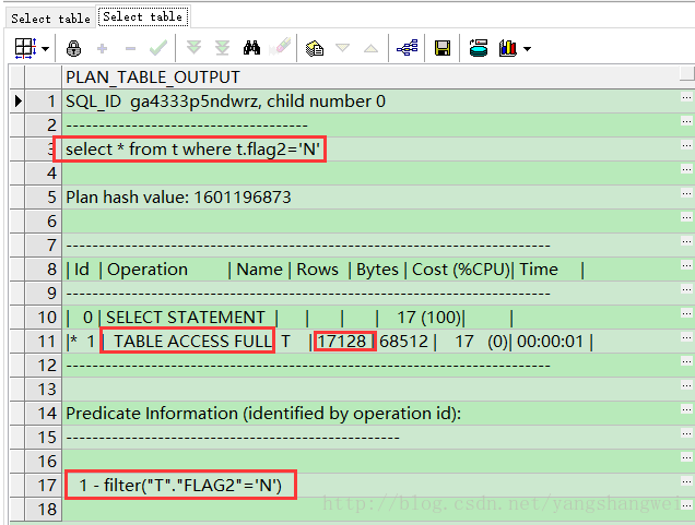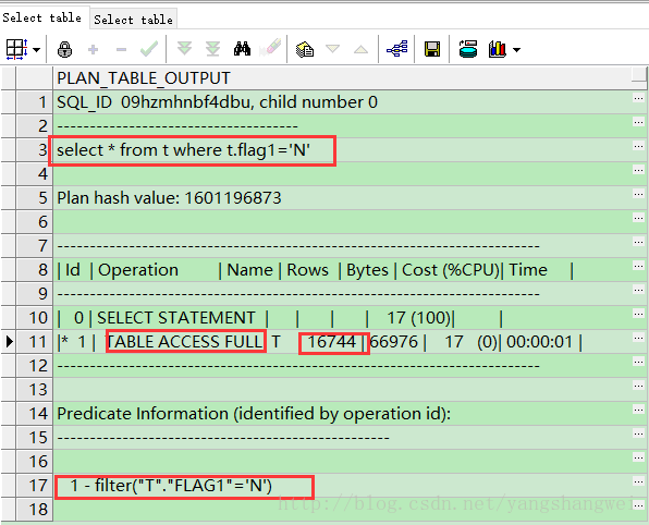 在这个试验中,CBO估算出来的结果集我们从图中可以看到16744 非常接近与实际值 ,因为对已flag1来讲 ,等于N的记录是整个记录的一半(等于Y的记录是另一半),这在统计信息里面可以获取到,此时CBO表现正常。