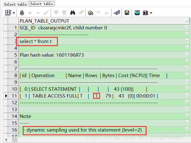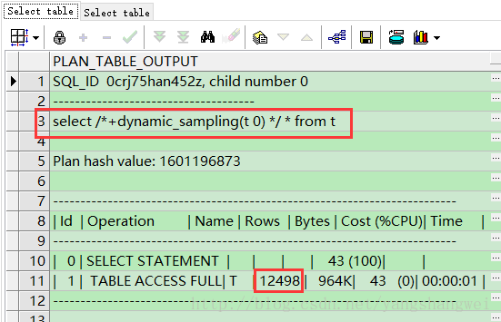 SQL> select * from table(dbms_xplan.display_cursor('ckzaraqcmkr2f',0)); 可能看出 2 个执行计划的差别。 在没有采用动态分析的情况下, CBO 对 t 表估计的还是 12498 行记录,但是用动态分析就显示 1 条记录。