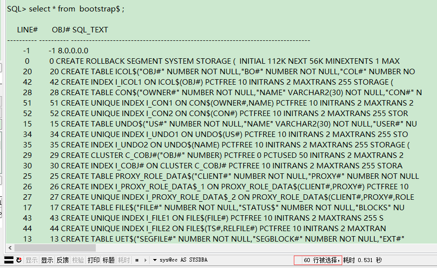 bootstrap$ 实际上存储的是数据字典的基表的定义,如 OBJ$,C_OBJ$,TAB$等等。