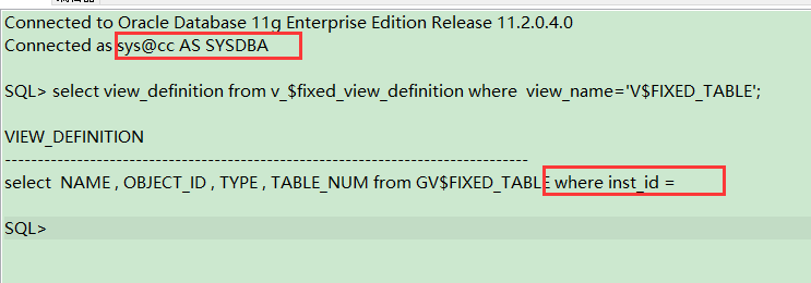 select inst_id,kqftanam, kqftaobj, 'TABLE', indx from x$kqfta union all select inst_id,kqfvinam, kqfviobj, 'VIEW', 65537 from x$kqfvi union all select inst_id,kqfdtnam, kqfdtobj, 'TABLE', 65537 from x$kqfdt 从这里, 我们找到了 GV$FIXED_TABLE 视图的创建语句,该视图基于 X$表创建。