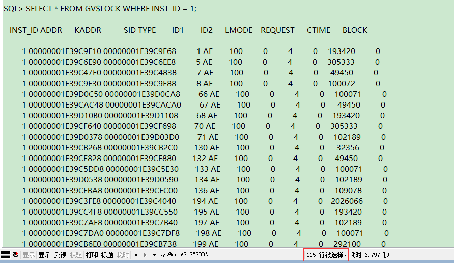SQL>SELECT * FROM GV$LOCK WHERE INST_ID = 1; 表示从实例 1 上的 V$ 视图中检索信息。