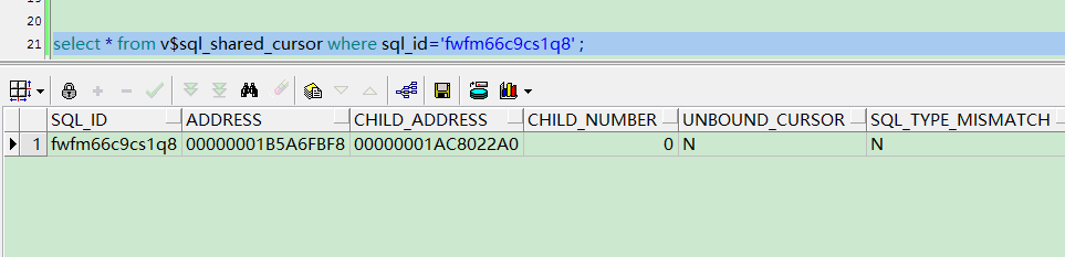 select * from v$sql_shared_cursor where sql_id='fwfm66c9cs1q8' 如 果 这 里 有 Y , 就 是 导 致 不 能 重 用 的 原 因 , 这 些 字 母 和 V$SQL_SHARED_CURSOR 每个字段对应。
