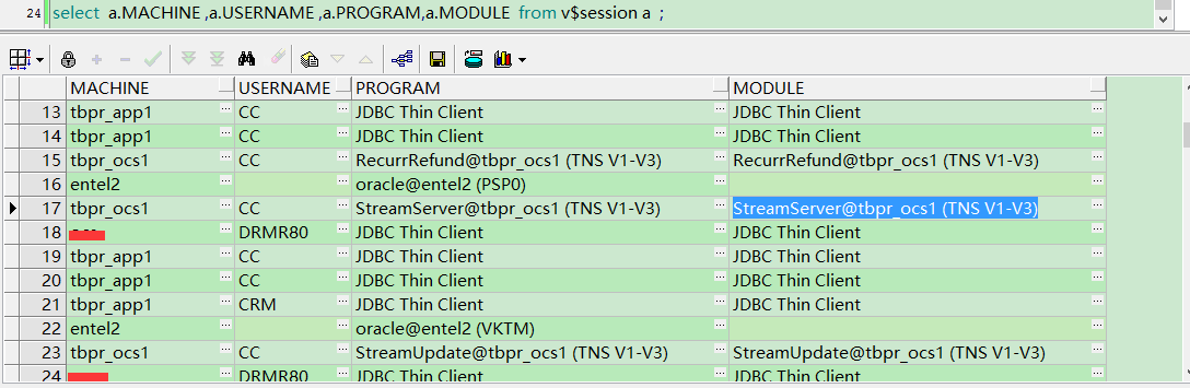 - module 是 Oracle 的存储过程DBMS_ALLPLCATION_INFO.SET_MODULE 给出的执行程序的名称。
