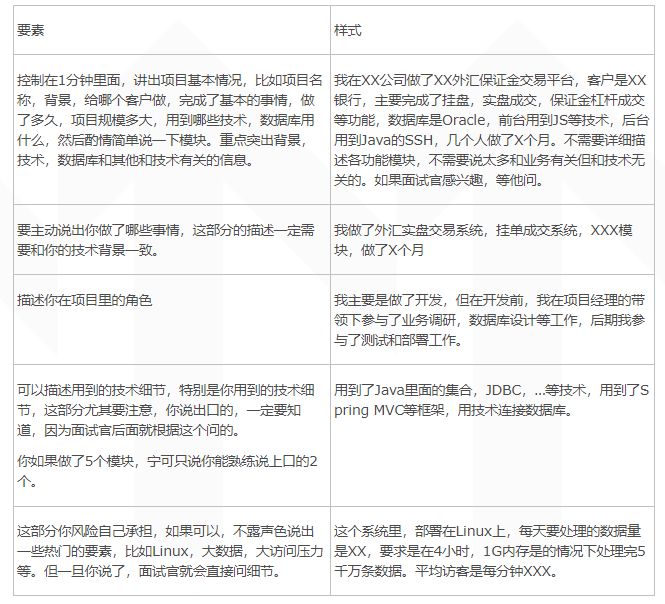 在避免上述不好的回答的同时,大家可以按下表所给出的要素准备项目介绍。如果可以,也请大家准备一下用英语描述。其实刚毕业的学生,或者工作经验较少的人,英语能力都差不多,但你说了,这就是质的进步。