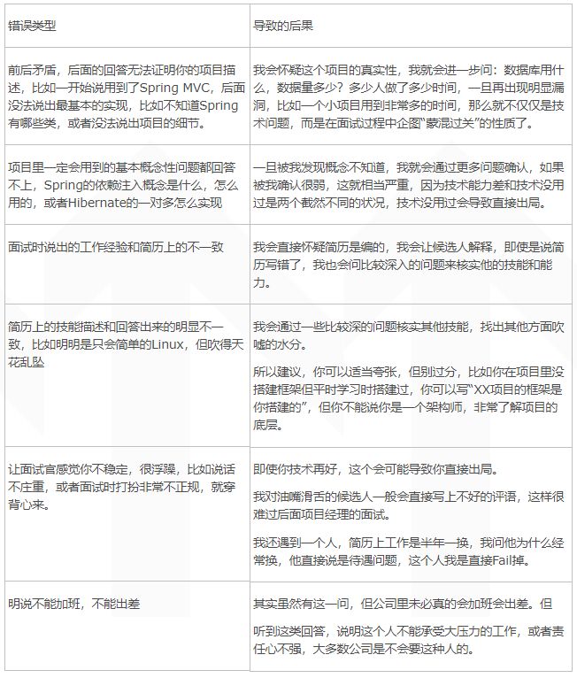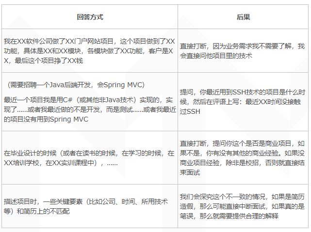 根据我们的面试经验,发现有不少候选人对此没准备,说起来磕磕巴巴,甚至有人说出项目经验从时间段或技术等方面和简历上的不匹配,这样就会造成如下的后果。