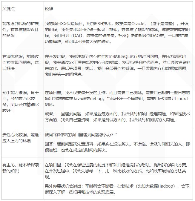 比如:在这个项目里用到了什么技术?你除了说一些基本的技术,比如Spring MVC,Hibernate,还有数据库方面的常规技术时,还得说,用到了Java内存管理,这样能减少对虚拟机内存的压力,或者说用到了大数据处理技术等。也就是说,得找一切机会说出你拿得出手的而且当前也非常热门的技术。