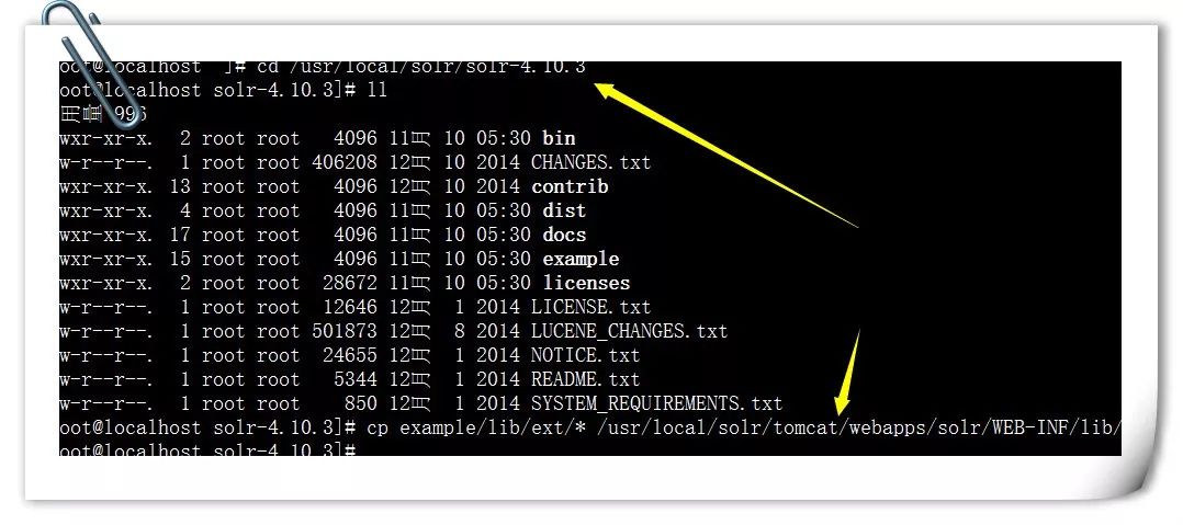 命令:cp -r /usr/local/solr/solr-4.10.3/dist/solr-4.10.3.war /usr/local/solr/tomcat/webapps/solr.war