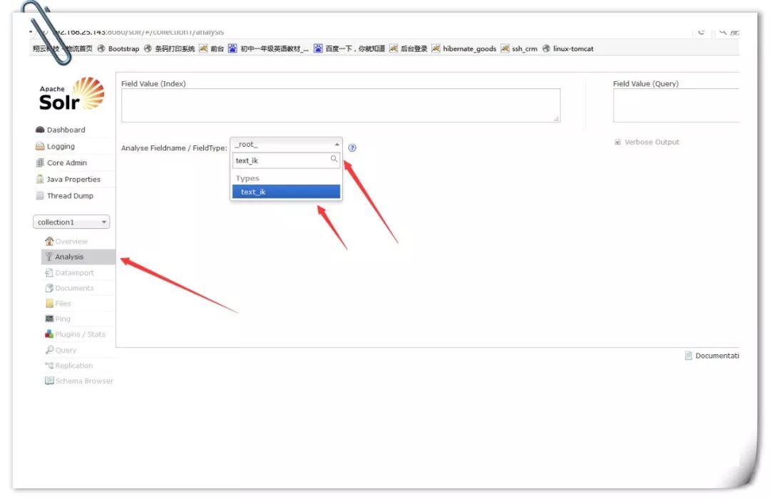 下面需要中文分词就需要将type的值等于text_ik,如果不需要分词的就可以使用其它类型,比如string,long等等