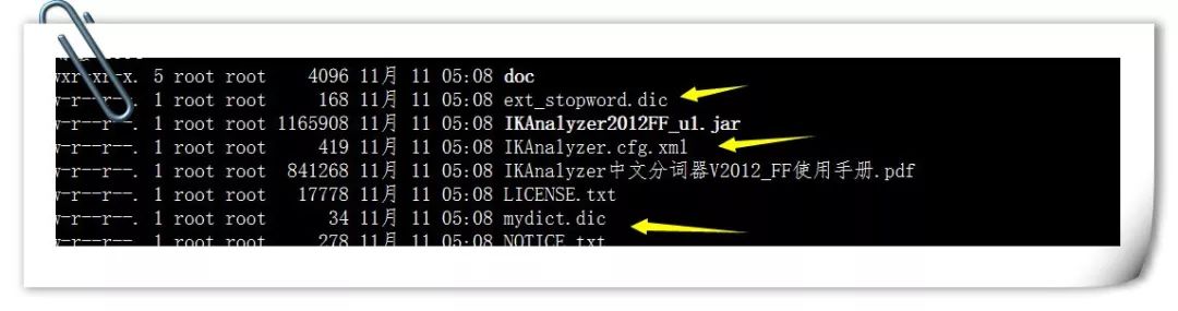 命令:cp ext_stopword.dic IKAnalyzer.cfg.xml mydict.dic /usr/local/solr/tomcat/webapps/solr/WEB-INF/classes/