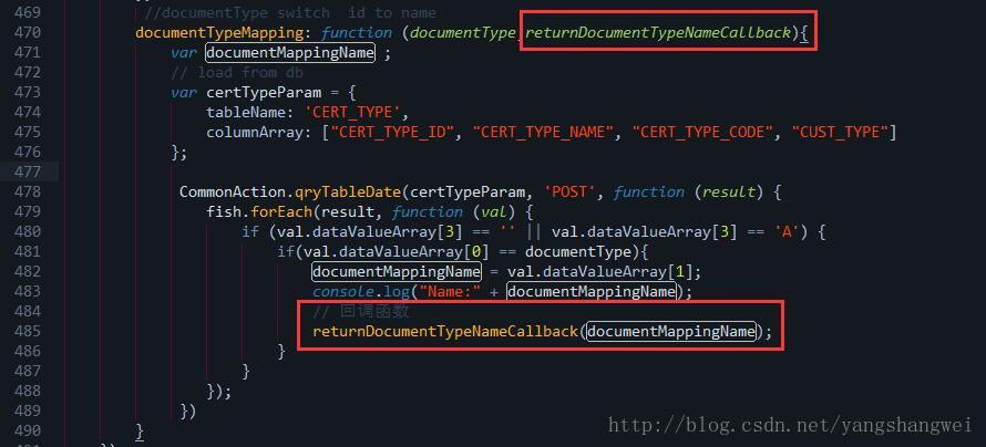 CommonAction.qryTableDate是异步调用的,所以在外层无法获取函数里面的值,不能直接返回,采用回调的方式 :给documentTypeMapping这个函数设置一个回调函数,在CommonAction的回调里面调用传过来的这个回调函数。