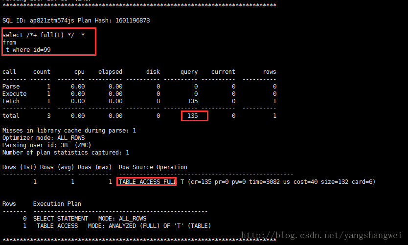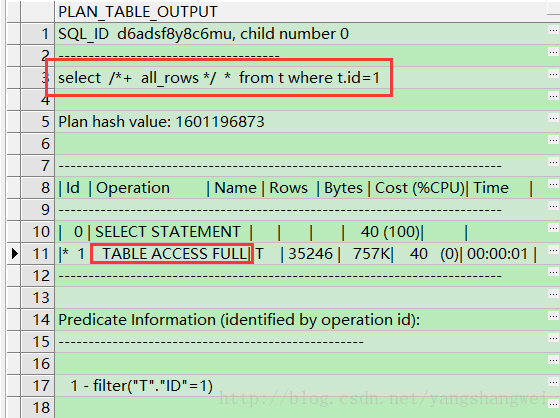 SQL>select * from table(DBMS_XPLAN.display_cursor('d6adsf8y8c6mu',0)); SQL>select /*+ all_rows */ * from t where t.id=99;