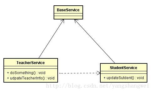 我们来举个例子,TeacherService#doSomething()方法内部调用了 调用本类的udpateTeacherInfo还有StudentService#updateSutdent()方法,这两个类都继承于BaseService,类结构如下:
