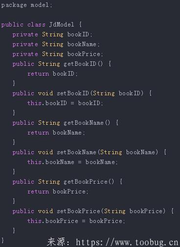 用来封装对象,我要抓取一本书的数据包括,书籍的id,书名及价格。ecliplse中生成set、get方法的快捷键是shift+alt+s然后选择生成setter、getter